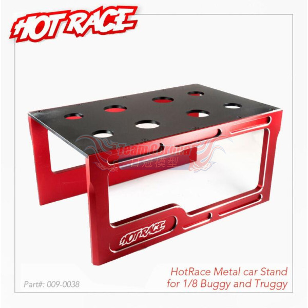 Sturdy and stylish, the Hotrace Metal Car Stand is made of precision-cut aluminum, ideal for 1/8 buggy and truggy. Includes foam pads and comes in red.