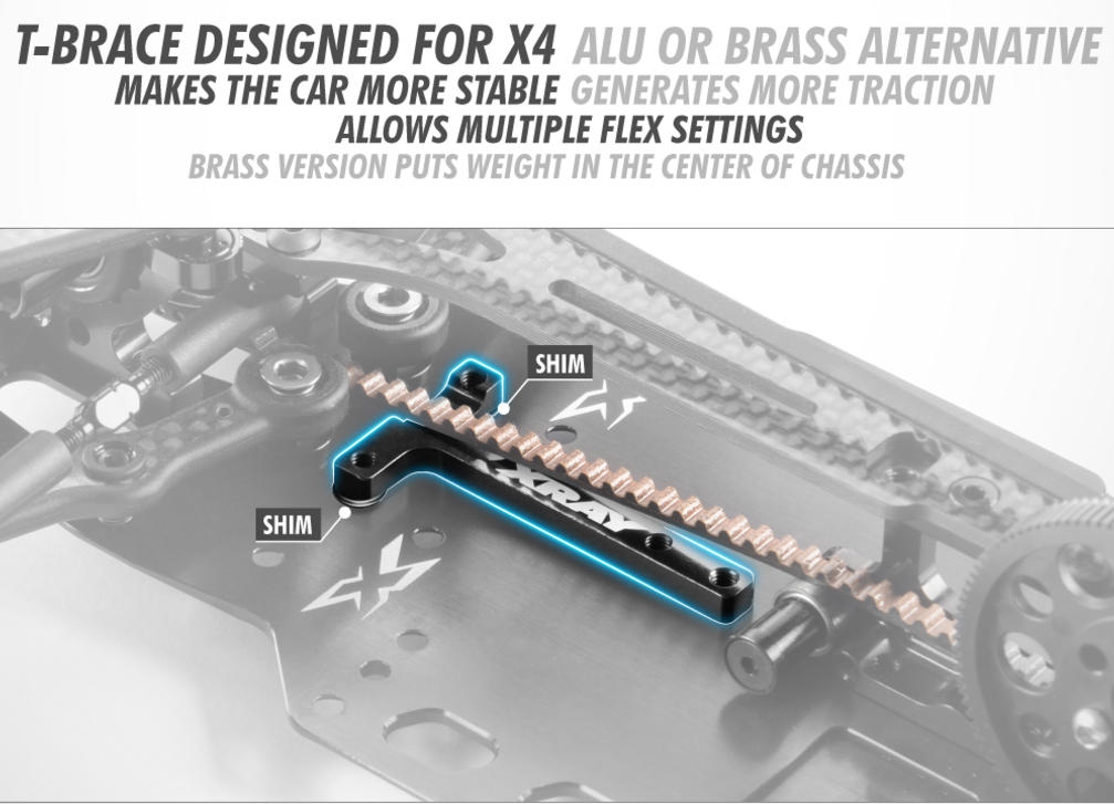 Alu & Brass chassis T-brace designed for X4 makes the car more stable, generates more rear traction and allows chassis flex adjustments to alter steering characteristics by adding and removing screws from the brace. Brass material puts weight in the center of the chassis and helps to lower the CG.