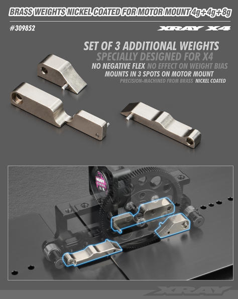 CNC-machined brass nickel coated weights specially designed for X4 are mounted straight onto the motor mount in 3 spots. Adding the weights to the motor mount does not compromise chassis space or flex. The weights are secured using 2.5x8mm screws. The weights are added to the middle of the car which ensures no effect on the front to rear weight bias.