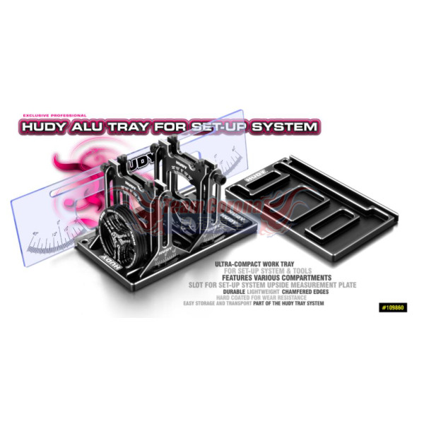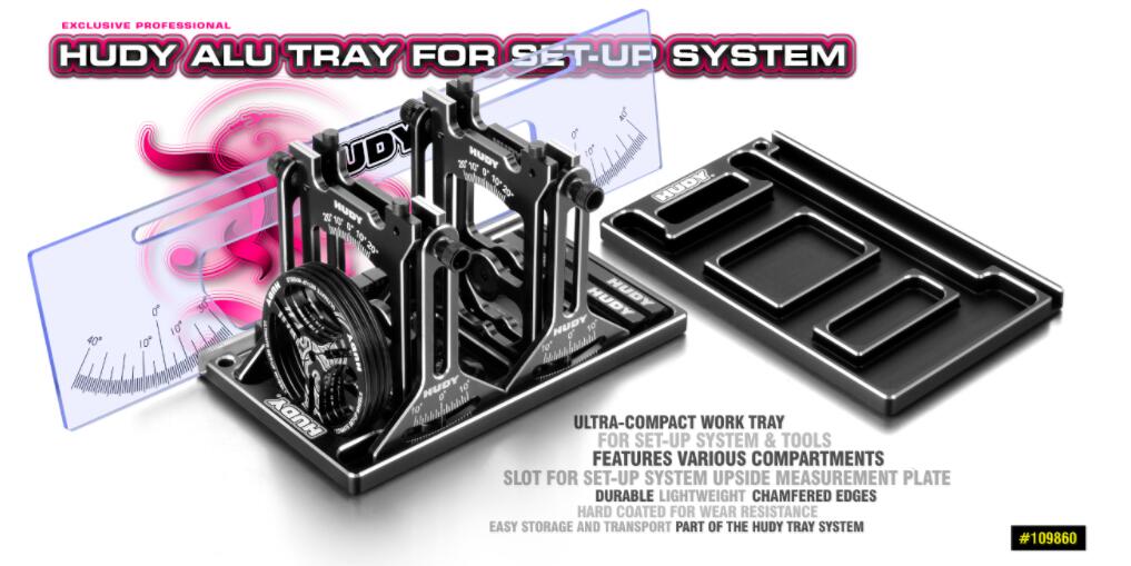 The parts tray features various compartments for set-up system parts, shock stands, set-up wheels, balancing tools, and other accessories. Perfect for all classes and scales. Rear part of the tray features slot for set-up system upside measurement plate.