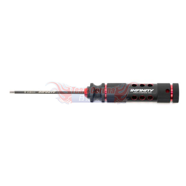 The ultra-lightweight machined aluminum grip is finished perfectly with the Team INFINITY logo and black and red anodizing. The overall thickness and knurling position have been optimized to provide an excellent grip. The tip is made of carbide steel and is perfectly sized to fit each size of screw head, making it the world's top team spec tool.